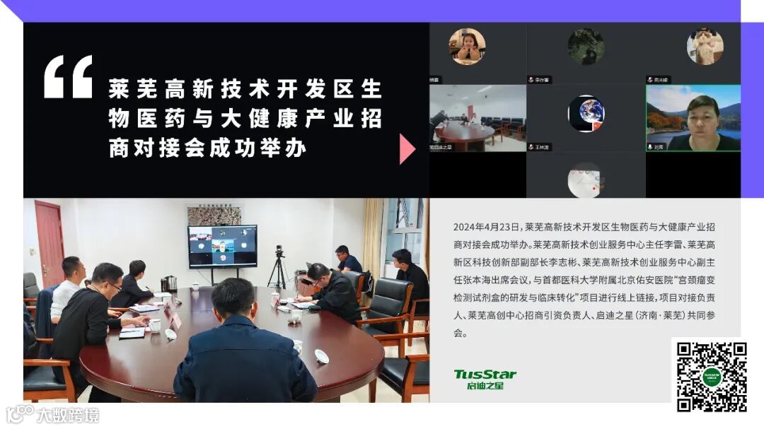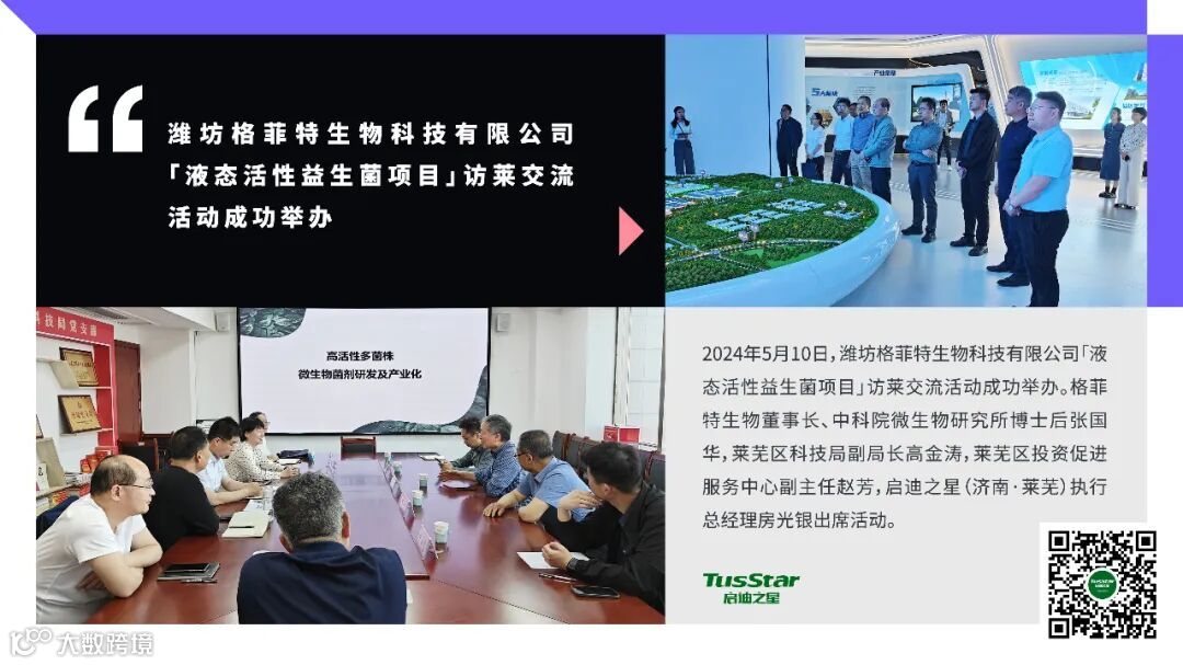 举办招商对接活动,促进项目落地生根。邀请莱芜区科技局副局长刁廷伟一行赴潍坊市百奇微生物科技有限公司进行项目招商调研,深入了解企业技术与发展模式,探寻合作机会;组织潍坊格菲特生物访莱交流并参观莱芜鲁中国际生物谷,促进双方相互了解与合作意向;为莱芜高创中心对接中国科学院理化技术研究所、首都医科大学附属北京佑安医院、未来医疗科技(北京)有限公司、港股上市公司冠泽医疗等项目,积极推动项目落地交流,为莱芜区相关产业发展注入新活力。