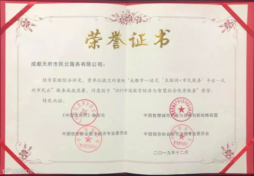 赞誉接踵而至。在四天前,也就是12月13日,在北京召开的2019年第二届智慧社会发展大会暨首届中国数字经济高质量发展论坛上。天府市民云作为成都市一站式“互联网+市民服务”平台,斩获 “中国信息界70家优秀企业”和“2019中国数字经济与智慧社会优秀案例奖”两项重要大奖。荣誉背后,既是社会各界对成都通过互联网实现共享、共治创新范式的肯定,也在为超大城市的智慧治理提供着“成都方案”。