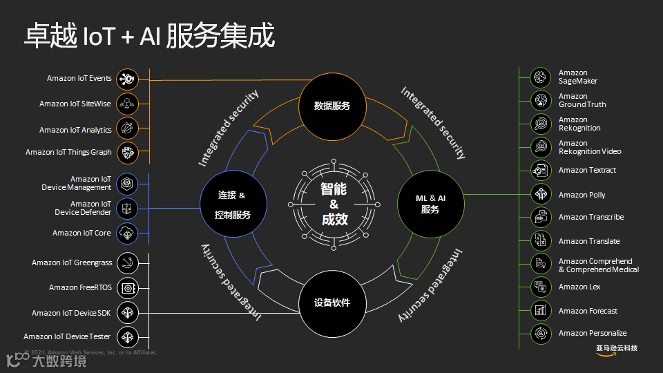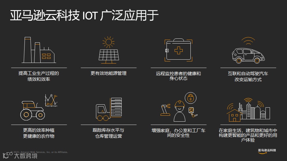 作为全球领先的云计算服务和云解决方案提供商,亚马逊云科技IoT服务在全球拥有数以万计的客户,其中超过90%的财富100强公司都在使用亚马逊云科技和合作伙伴的解决方案,应用领域包括工业、农业、仓储、能源、医疗、建筑、交通、家居等。通过将IoT与AI技术结合,亚马逊云科技AIoT,以云为基础,从物的泛在联接、物的场景化孪生、物与智能世界的全面协同,不断加速各行业的数字化转型。