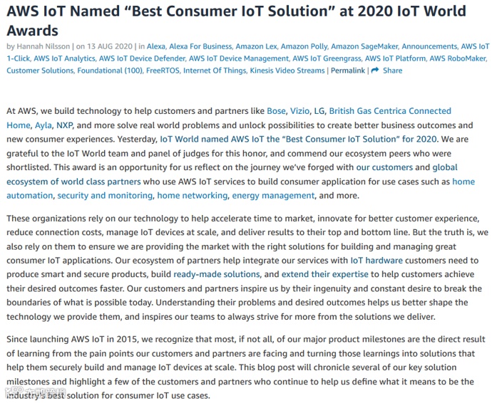 ▲IoT荣获2020年世界物联网大会——全球最佳消费物联网解决方案