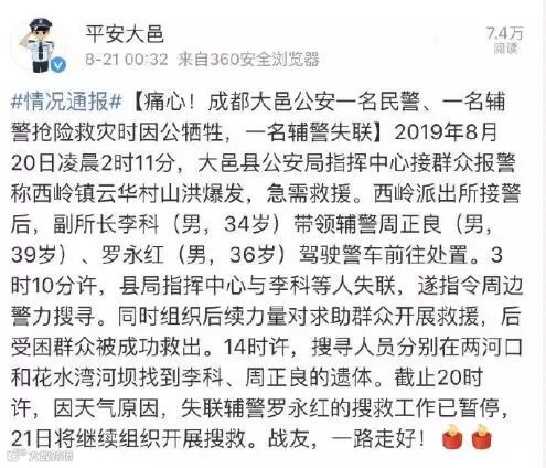 20日14时许,搜寻人员分别在两河口和花水湾河坝发现李科、周正良同志的遗体,另一名辅警罗永红截至目前仍然处于失联状态,当地仍在全力搜救。截至20日20时许,因天气原因,失联辅警罗永红的搜救工作已暂停,21日搜救工作继续展开。