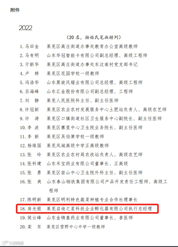 近日,济南市莱芜区科协发布了《关于选树莱芜区2022年度(首批)优秀科技工作者人选的公示》,其中启迪之星(济南·莱芜)执行总经理房光银荣获“莱芜区2022年度(首批)优秀科技工作者”称号。 ▲ 公示截图 2018年3月,房光银加入启迪之星,启迪之星落地莱芜以后全面负责启迪之星(济南·莱芜)孵化基地的筹建和运营工作。目前,启迪之星(济南·莱芜)孵化基地已孵化企业40家,服务企业200多家,2021年荣获工业和信息化部全国首批“中小企业志愿服务工作站”荣誉称号,启迪之星在助力莱芜区企业创新发展、国内外学术交流、促进科技成果转化、推进科普信息化建设等方面发挥着越来越重要的作用。 保持行业前瞻性,将具体工作经验与学科发展相融合。2019年,房光银作为骨干成员参与山东省重点研发计划(软科学)重点项目《山东省科技企业孵化器和众创空间发展对策研究》并顺利结题,研究成果在山东多地的科技创新政策制定中被吸收采纳,取得良好的经济和社会效益。2021年在英文期刊《Advances in Educational Technology and Psychology》发表论文《Analysis on the Development Countermeasures of Shandong Science and Technology Business Incubator》,2022年在中文期刊《现代工业经济和信息化》发表《基于SCP范式的山东省科技企业孵化器发展研究现状》。