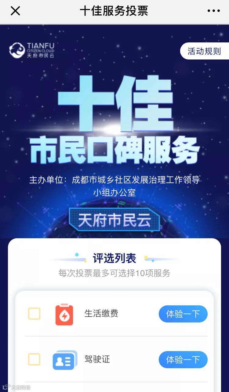 2)活动期间,每个天府市民云App实名认证账号,每天1次投票机会,每次投票最多可选择10项不同服务。