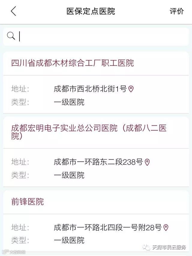 天府市民云还可以查询『医保定点医院』、『医保定点药店』、『医保诊疗项目』、『医保药品目录』。以后看病买药,不用四处打听医保到底怎么用了,直接来天府市民云搜索吧。