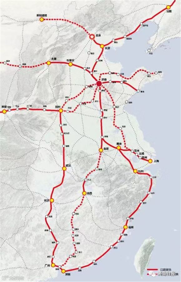 在3月31日公示的济南城市发展战略规划中,济南提出强化高铁枢纽,积极连接京沪二线、京九高铁等国家通道,建设7条通道、12条辐射线,形成“米”字形高铁网络。