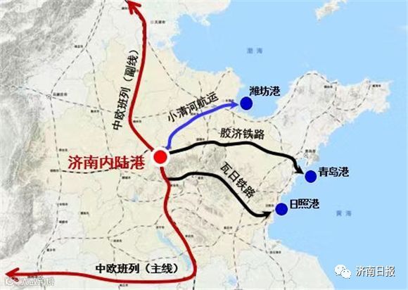 济南正致力于打造海陆空一体的国际内陆港,强化济南航空枢纽地位,建设临空经济区,依托铁路向西全面对接丝绸之路经济带,重点发展中欧班列,铁路货运向东以胶济铁路、瓦日铁路分别对接青岛港和日照港。