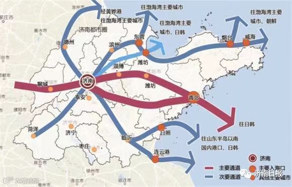 根据济南规划的出海交通体系,济南构建“两主五副通道、八大出海口”。这八大出海口分别是河北黄骅港,山东东营、潍坊、烟台、威海、青岛、日照,江苏连云港。“两主五副通道”线路分别为济南-德州经河北沧州黄骅港出海,通往渤海湾主要城市;济南-滨州-东营出海,通往渤海湾主要城市;以小清河通航工程为主,构建济淄潍出海通道,通往渤海湾主要城市和日韩;经滨州、东营、潍坊后,向东分别在烟台、威海出海,通往渤海湾主要城市和朝鲜;经淄博、潍坊(中部)通往青岛,经临沂(北部)通往青岛,这两个出海通道均以日韩为目的地;经临沂通往日照和连云港的出海口,以山东半岛以南国内港口和日韩为目的地。其中经由青岛出海的两条线路为主要出海通道,除小清河通航工程外,其余5条线路为次要通道。