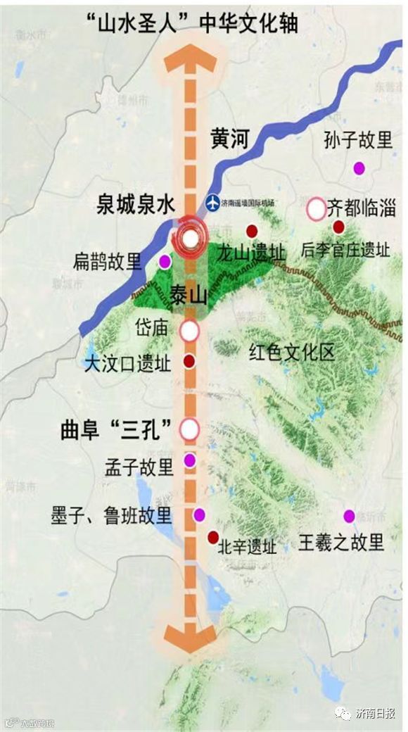 “山水圣人”中华文化高地示意图,中华文化轴北起济南黄河、南至枣庄滕州,向东包括滨州、临沂、淄博,向西到济宁,这一范围内有史前文化遗址、圣人故里、历史文化名城,儒家文化、泰山文化、泉水文化、齐鲁文化、红色文化辉映,重要文化旅游资源有黄河、泉水、泰山、齐长城、三孔,是中华民族重要的精神家园。