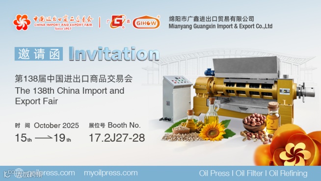 尊敬的各位新老客户,金秋十月,我们诚挚地邀请您莅临第138届中国进出口商品交易会。与我们一同探索榨油机设备领域的无限可能,共绘合作新蓝图。并莅临我们位于17.2J27-28号展位。