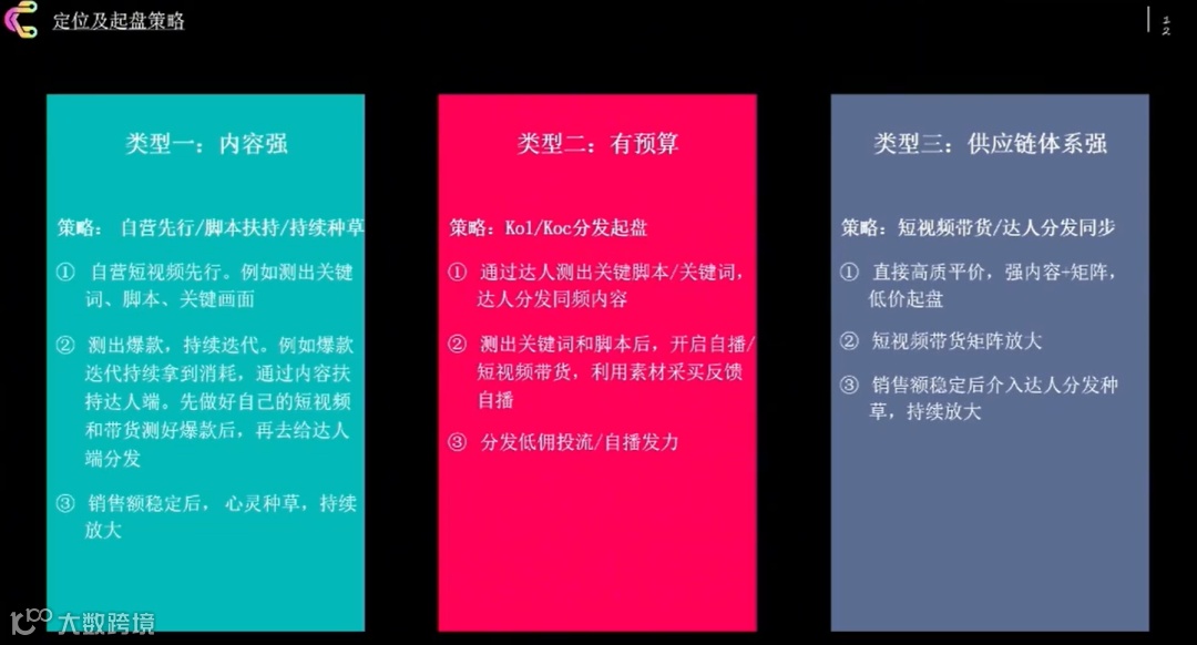 1. 内容起盘:坚持自营先行,先通过自营短视频完成爆款脚本、关键画面、产品卖点的测试,再对接达人进行批量放量;有预算的商家可直接通过 KOL/KOC 分发起盘,快速测试脚本和关键词,再通过自播、自营短视频放大,最后结合低佣 GMAX 投流实现增量;