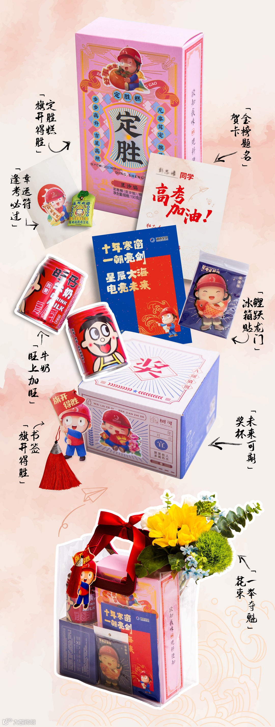 这注定不平凡的时刻,星电集团将所有代表幸运、象征收获的祝福凝结成“一举夺魁”的花束、 “旺上加旺” 的牛奶、“逢考必过”的幸运符、“旗开得胜”的定胜糕、“未来可期”的“奖杯”,组成一份份“加油包”,送到每一位即将上战场的星电少年手上,希望为他们多增一分直面战场的勇气。