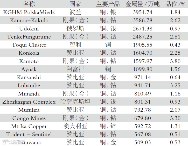 大于1000万吨的沉积岩型层状铜矿床8个,铜资源储量18905万吨。主要分布于刚果(金)(3个),以及波兰、赞比亚、俄罗斯、智利(各1个);