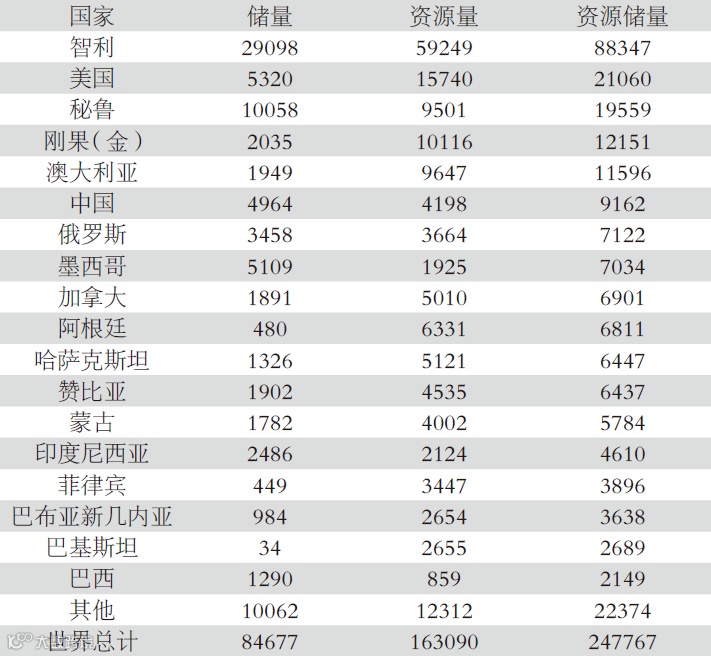 2018年相关数据统计,储量超过1亿吨的国家为智利、秘鲁;1亿~5000万吨的国家为美国、墨西哥;5000~1000万吨的国家为中国、俄罗斯、印度尼西亚、刚果(金)、澳大利亚、赞比亚、加拿大、蒙古、哈萨克斯坦、巴西。