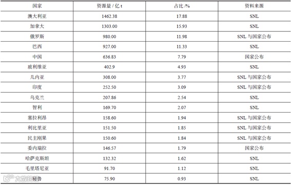 根据相关国家资料及参照SNL(提供全球矿业信息和服务的数据平台)全球铁矿统计,全球铁矿资源量达到8180亿t。,全球铁矿资源分布极不均衡,位列前10位的国家依次是澳大利亚、加拿大、俄罗斯、巴西、中国、玻利维亚、几内亚、印度、乌克兰和智利,这10 个国家铁矿资源量就达到6650 亿t,占全球资源总量的81.3%,其中澳大利亚以1462亿t位居首位,约占全球总资源量的17.88%;加拿大以1303亿t 位居第二,俄罗斯以980 亿t 位居第三,巴西以927 亿t 排名第四,而很多国家和地区铁矿资源又相对缺乏。