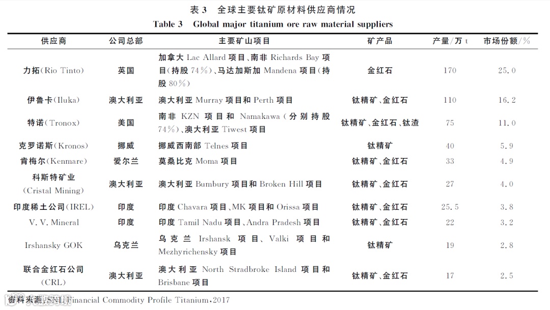 2017年全球钛矿原材料产量为708万t(以TiO2当量计),其中前十大供应商产量约占全球总供应量的79%,前六大供应商垄断了超过60%的市场份额(表3),其中,力拓(Rio Tinto)、伊鲁卡(Iluka)和特诺(Tronox)分别控制了加拿大、澳大利亚、南非主要的钛矿资源和原料供应。目前,中国虽然存在众多中小型钛矿原材料生产企业,但还没有能跻身全球前十位的企业,且产量和质量上都不能满足国内下游企业对钛原料的需求,每年仍需要从越南、澳大利亚等国进口大量的高品质钛原料。