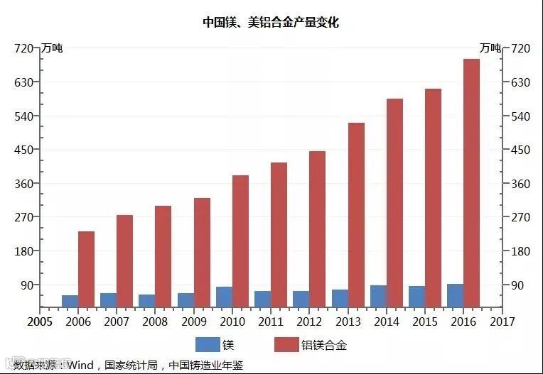 近十年来,我国镁矿的年产量从60万吨增长到100万吨,总增长67%;镁合金(数据为镁合金的代表:镁铝合金)年产量从230万吨增长到690万吨,总增长200%,远超过镁产量的增长速度。说明市场对镁合金需求强劲。