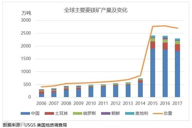 全球菱镁矿产量从2006年至2014年之间一直保持稳定增长态势,2015年全球菱镁矿产量出现爆发式增长,总产量较2014年翻了3倍多,之后产量增速明显下滑。中国是菱镁矿产量大国,全球产量的70%左右由中国提供。