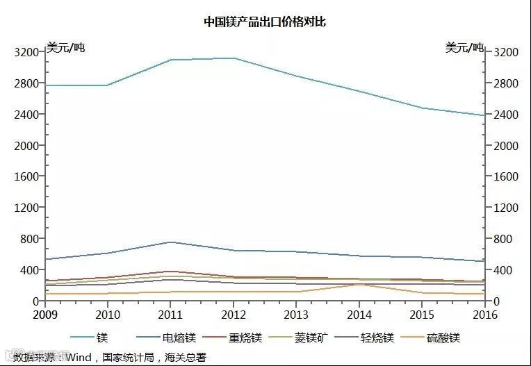 出口平均价格最高的产品是金属镁,平均价格是重烧镁产品出口价格的10倍左右,结合金属镁出口量,近几年金属镁出口量变化不大,而出口价格有所下降,说明中国之外的市场对镁的消费没有大的增长,镁的消费增长主要依靠国内市场带动;电熔镁产品的出口价格排名第二;而出口量较大的菱镁矿、重烧镁、轻烧镁价格相对较低,产品附加值不高。