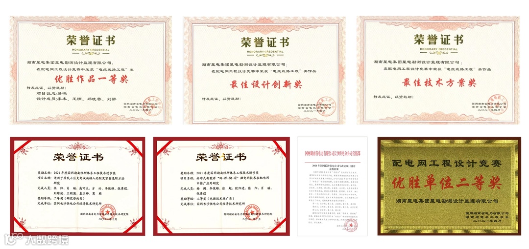 省公司配网设计竞赛优胜单位二等奖、最佳技术方案奖、优胜作品一等奖、最佳设计创新奖