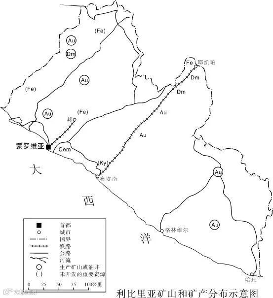 金:利比里亚已知原生金矿(脉矿)产于南方的条带状铁建造和Birimian岩石中,特别是在大吉德州。