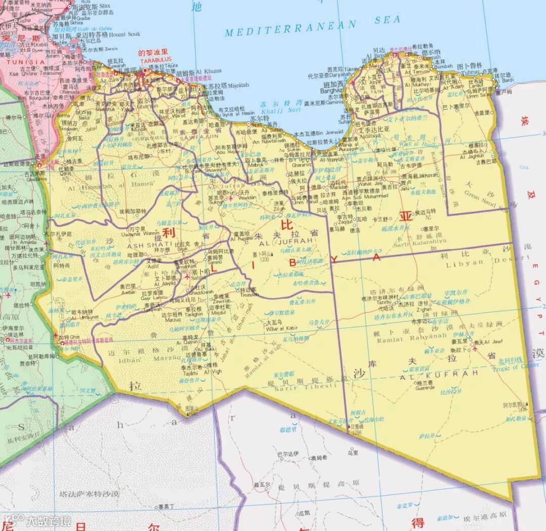 利比亚地处非洲北部,东接埃及和苏丹,西邻突尼斯和阿尔及利亚,南界尼日尔和乍得,北濒地中海,海岸线长1900余公里。全境95%以上地区为沙漠和半沙漠,沿海和东北部内陆区是海拔200米以下的平原,其他地区基本上为沙砾覆盖,为向北倾斜的高原和内陆盆地。