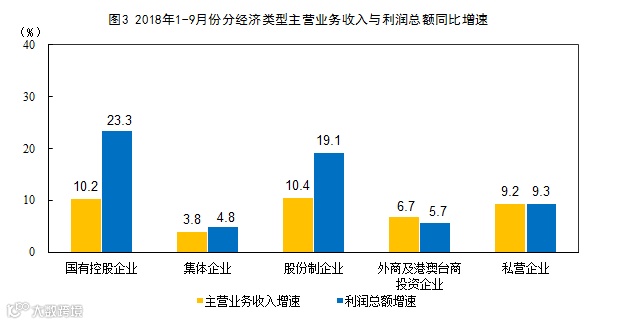1-9月份,规模以上工业企业中,国有控股企业实现利润总额15294.3亿元,同比增长23.3%;集体企业实现利润总额145.9亿元,增长4.8%;股份制企业实现利润总额35088.8亿元,增长19.1%;外商及港澳台商投资企业实现利润总额12352.8亿元,增长5.7%;私营企业实现利润总额12591.5亿元,增长9.3%。