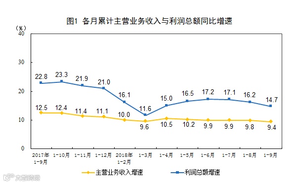 1-9月份,全国规模以上工业企业实现利润总额49713.4亿元,同比增长14.7%(按可比口径计算,考虑统计制度规定的口径调整、统计执法增强、剔除重复数据、企业改革剥离等因素影响,详见附注二),增速比1-8月份放缓1.5个百分点。