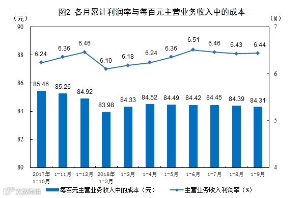 1-9月份,规模以上工业企业实现主营业务收入77.1万亿元,同比增长9.4%;发生主营业务成本65万亿元,增长9.1%;主营业务收入利润率为6.44%,同比提高0.29个百分点。