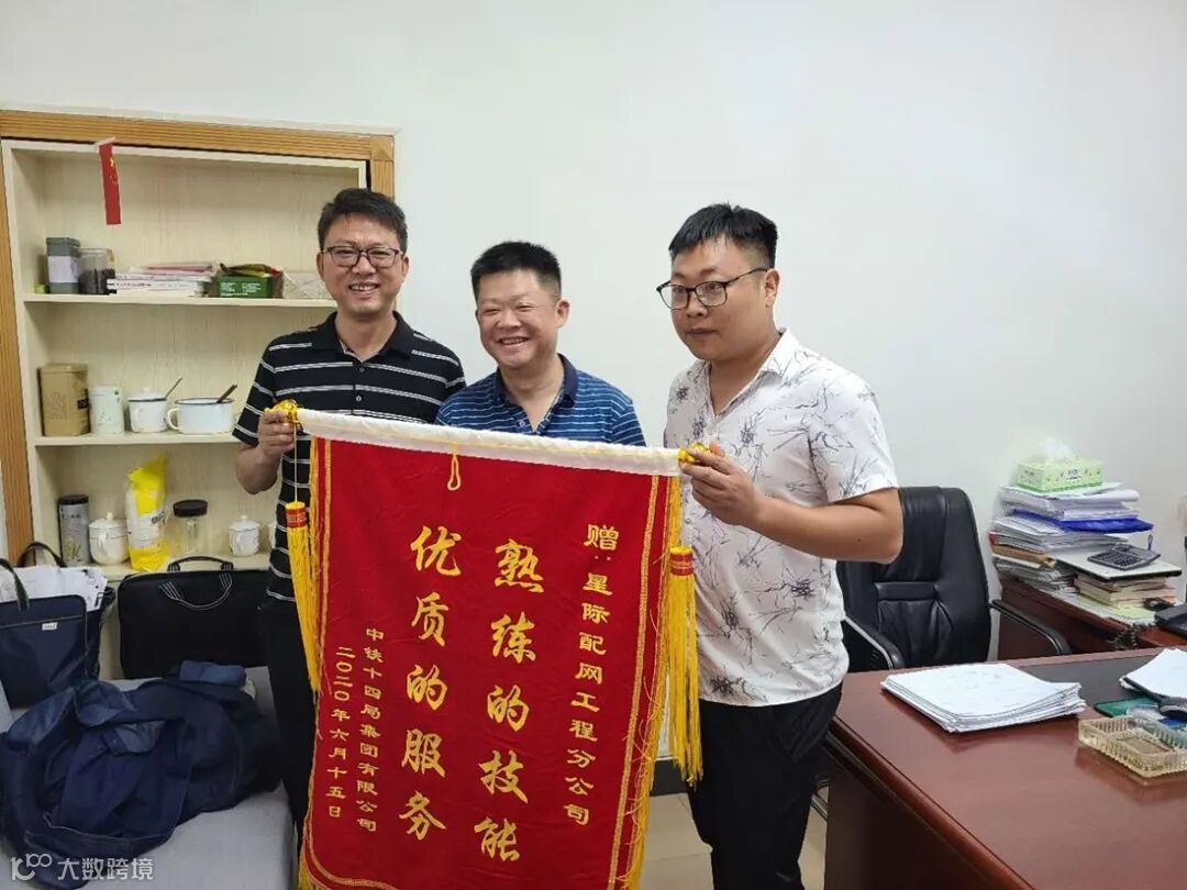 6月17日上午,中铁十四局集团有限公司的两位主要负责人,将一面写“熟练的技能 优质的服务”字样的锦旗送到了星电集团星际配网工程分公司,对公司在中铁十四局的线路迁改工程中的精湛水平、忘我奉献,表示了高度的赞誉和衷心的感谢。