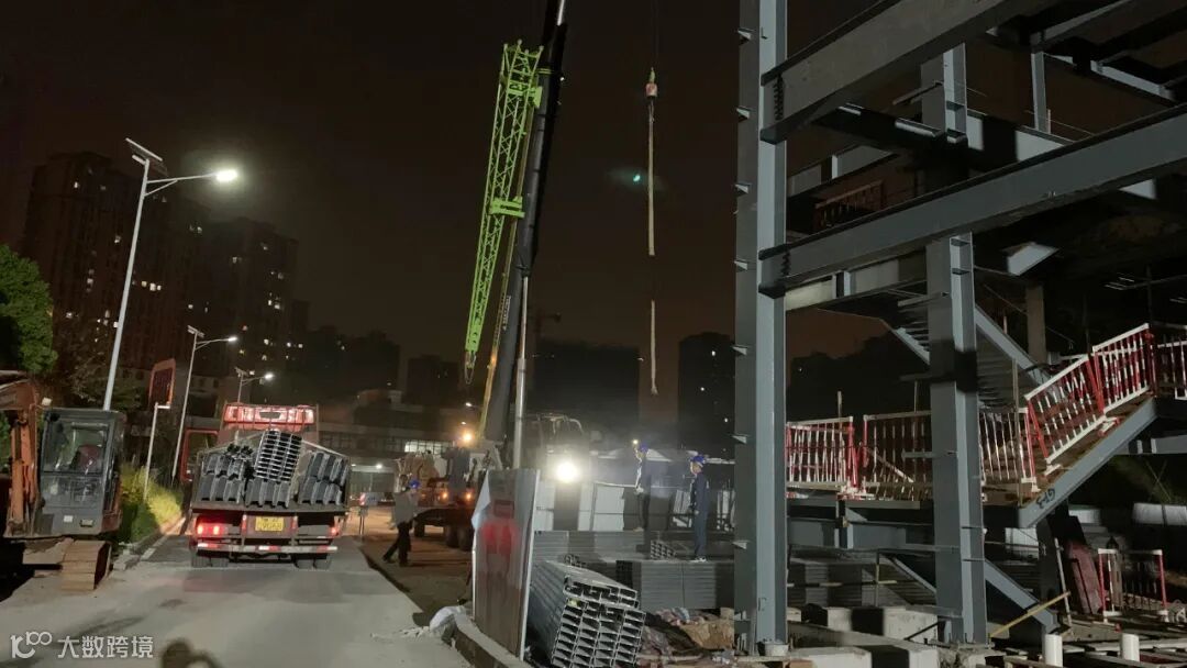 4月9日,钢结构进场。项目部外沟通内协调,争取到早上6点~23点的占道作业时间。但由于城市道路限行,钢结构只能晚上进场,为了节省时间成本和设备租赁成本,制定了凌晨1点~5点非公交运营时间段来吊装作业的方案。