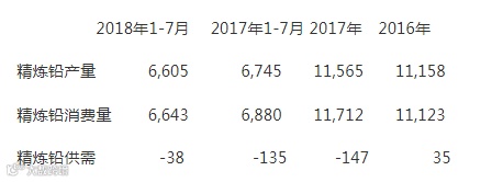 显示,2018年1-7月全球铅市场供应短缺3.8万吨,去年同期为供应短缺13.5万吨。 具体细节如下(单位:千吨)