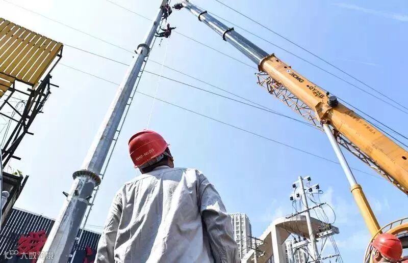 星际配网员工齐心协力新立20多吨电杆。