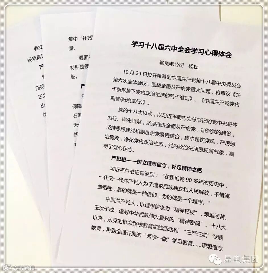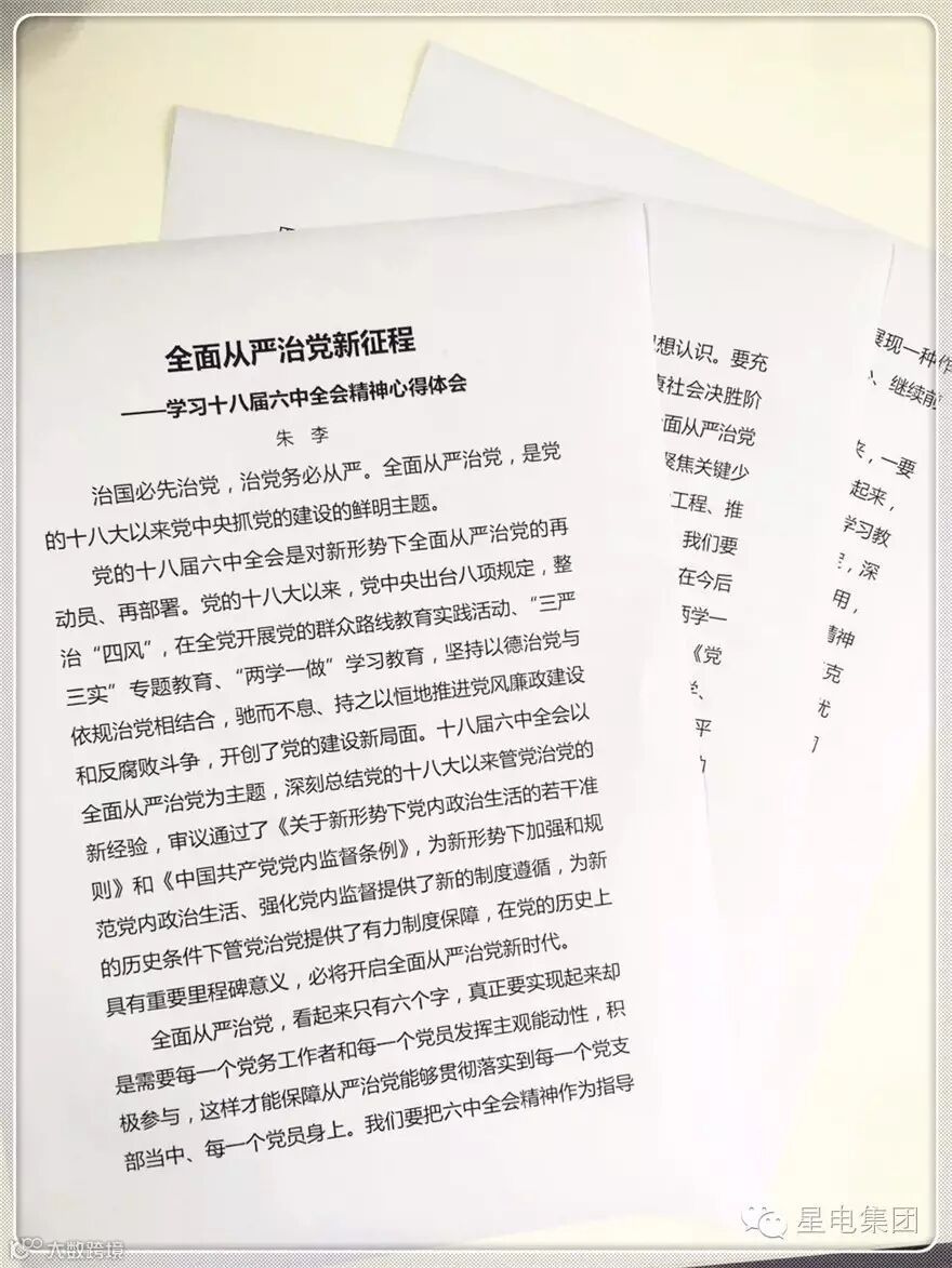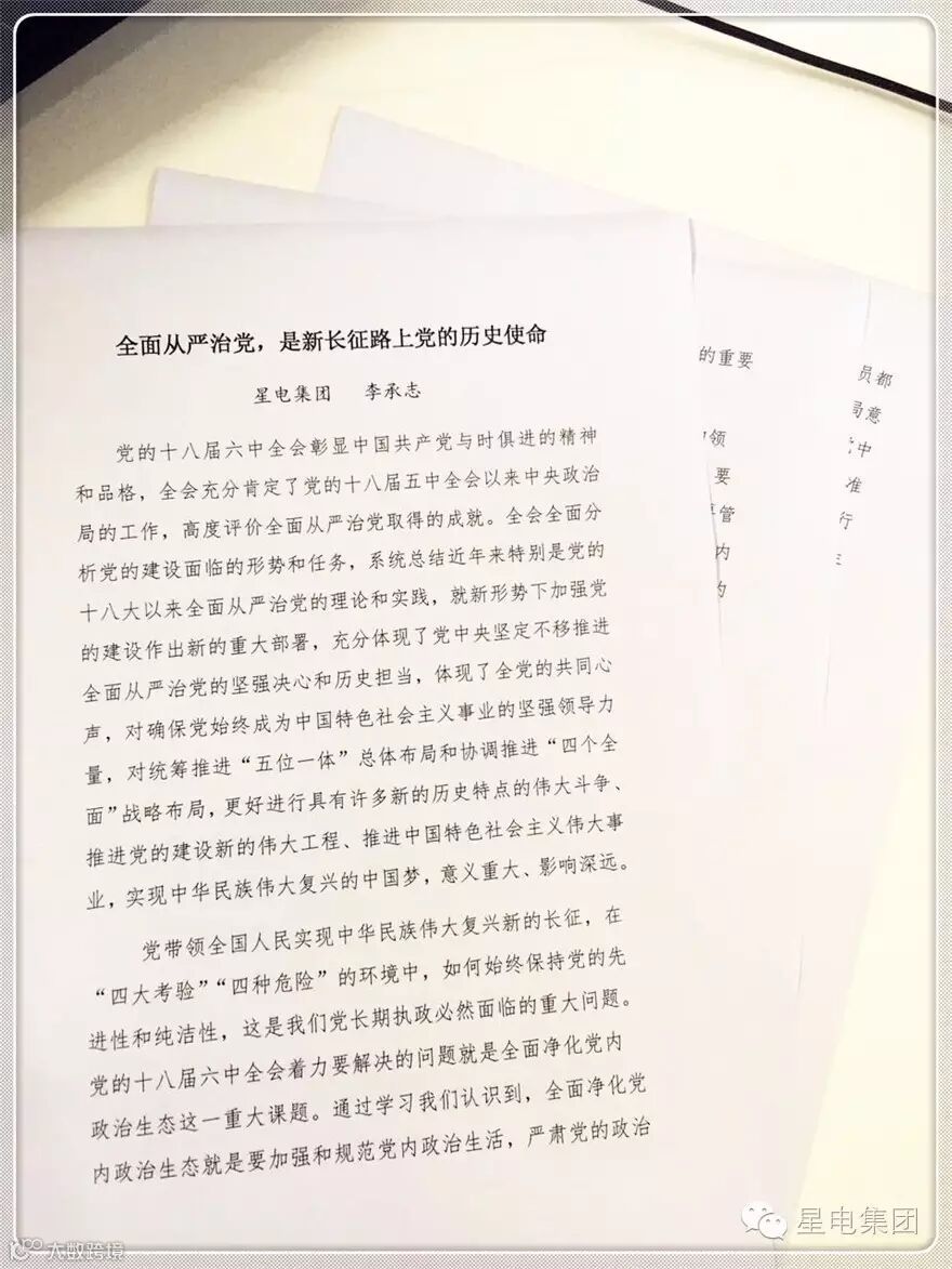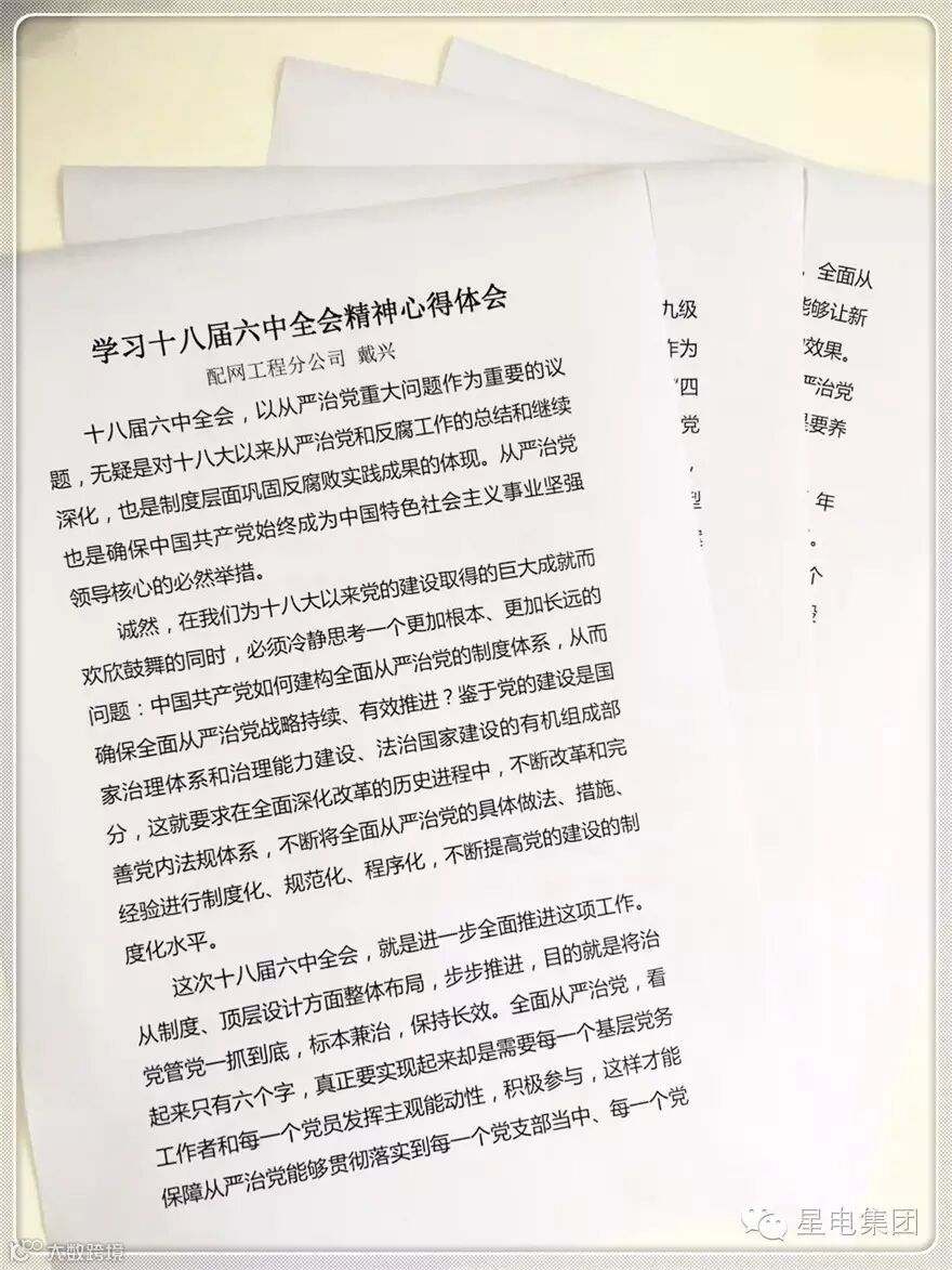 党的十八届六中全会召开后,响应上级组织号召,星电集团党总支迅速行动,研究部署对集团各分子公司进行贯彻落实全会精神的有关工作和要求,深入学习。重点要求写好一篇学习心得;开好一个学习专题交流会;出好一期学习专刊,营造了浓厚的学习氛围,让全体党员职工深入学习《准则》和《条例》,在集团公司掀起了学习热潮。