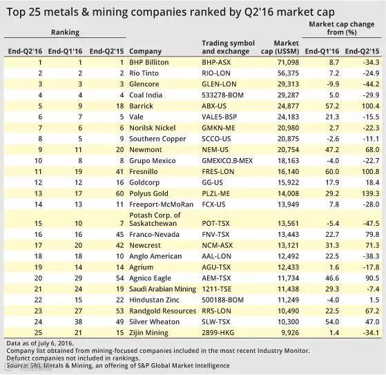 鑫海矿业视野该报告指出,巴里克黄金公司、纽蒙特矿业公司以及加拿大黄金公司是这段时间最大的赢家,它们的股价从1月1日至今分别上涨了189%、117%以及65%。与去年同期相比,这三家公司的排名分别上升了13、11和4位至第5、第9和第12位。