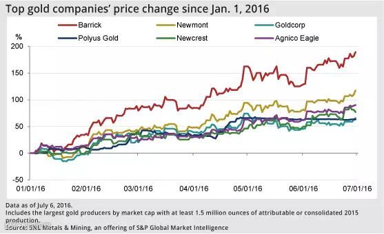该报告指出,巴里克黄金公司、纽蒙特矿业公司以及加拿大黄金公司是这段时间最大的赢家,它们的股价从1月1日至今分别上涨了189%、117%以及65%。与去年同期相比,这三家公司的排名分别上升了13、11和4位至第5、第9和第12位。