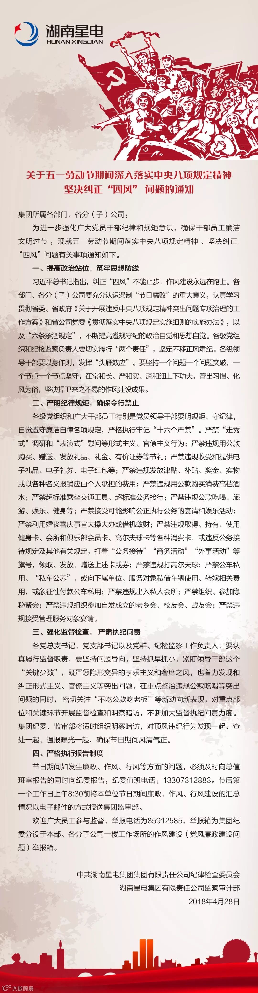 导读:中共星电集团公司委员会关于在2018年劳动节期间严守纪律规定的通知