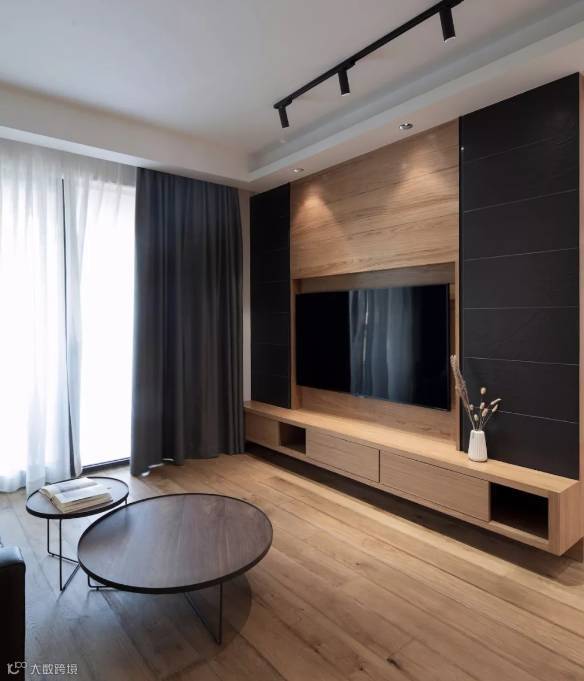 ▲ 电视背景墙采用木面结合黑色丝绸纹理砖,对称铺贴出简约造型,下方一字形悬空电视柜,让空间打扫不留死角。