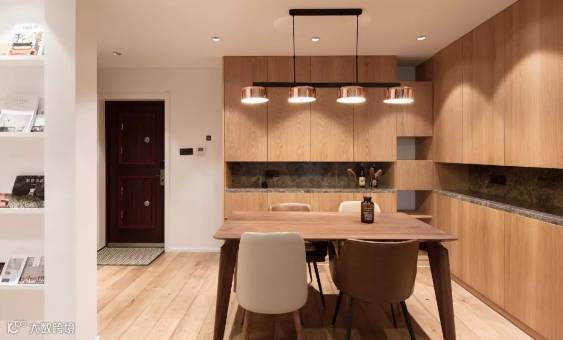 ▲ 餐厅就在入户右侧,地面通铺原木色地板,餐桌搭配不同颜色餐椅,呈现空间出趣味性,玫瑰金四头一字吊灯呈现强烈品质感。