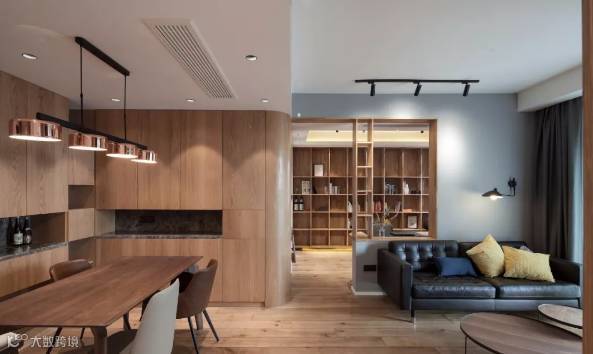 ▲ 餐厅弧度转角,沙发背景墙,半开放书房窗框,有效分割场域,又让空间相互串连起来。