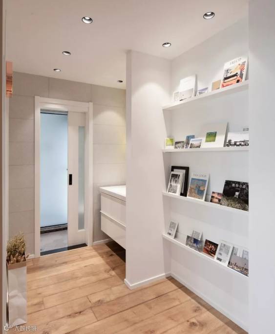 ▲ 利用后砌玄关隔墙,将背景设计成读物展示区,简单的设计增添公共领域使用机能。