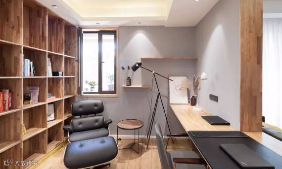 ▲ 书房大面积木制家具,搭配灰色漆墙面,一面墙完全用于书架墙,提升整个空间文化氛围。