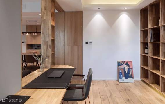 ▲ 由板材制作的办公桌,转角做大弧度切割,让书房与餐厅间的弧度形成“双曲线”流动空间。