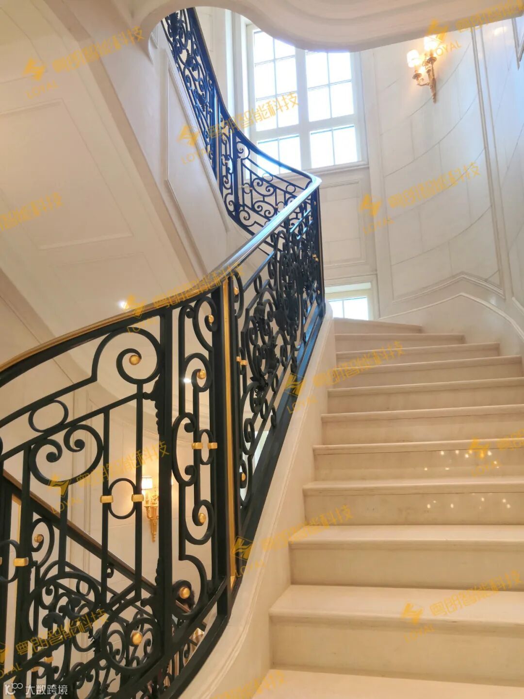 弧形楼梯需计算每根栏杆的倾斜角度,确保垂直受力。