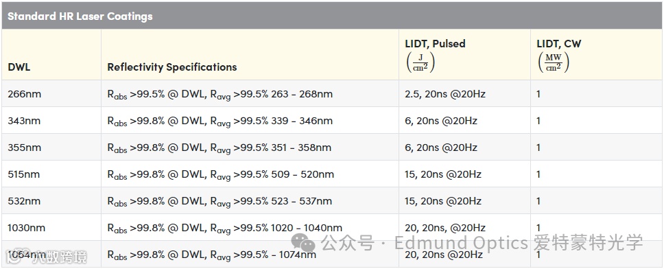 表 2: 爱特蒙特光学标准介质高反射率(HR)激光镀膜的反射率规格和保证激光诱导损伤阈值。对于其他激光波长,可根据需要定制镀膜设计