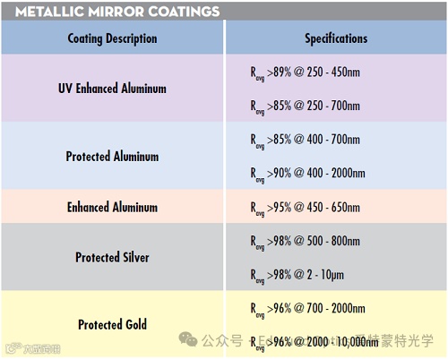 表 1: 爱特蒙特光学标准金属膜的反射率规格