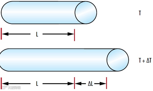 L 是原始长度,ΔL 是长度变化,αL 是线性 CTE,ΔT 是温度变化(图 1)。