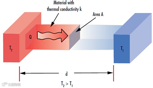 Q 表示在时间 t 内传递的热量,Q/t 的单位是 J/s 或者 W。A 是基片的横截面面积,ΔT 是材料一侧与另一侧之间的温差,d是材料的厚度。