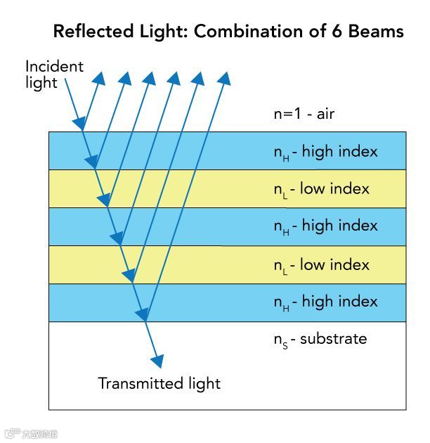 极紫外线系统应处于真空环境中,因为低于 100nm 的波长不能通过空气传播。同样,极紫外线辐射在几乎所有材料中都具有极高的吸收率,因此极紫外线应用中的光学元件几乎总是具有反射性。短波长的散射更高,这使得表面的粗糙度、平整度和表面公差对极紫外线光学元件很重要。在极紫外线应用中常用的反射镜是多层布拉格反射镜,两种不同材质的周期性堆叠导致特定波长进行干涉和反射。部分入射光束在堆叠的每个界面处反射。极紫外线多层反射镜具有非常窄的带宽,大约 1nm,这种类型的极紫外线光学元件需要与光源的波长特别匹配.