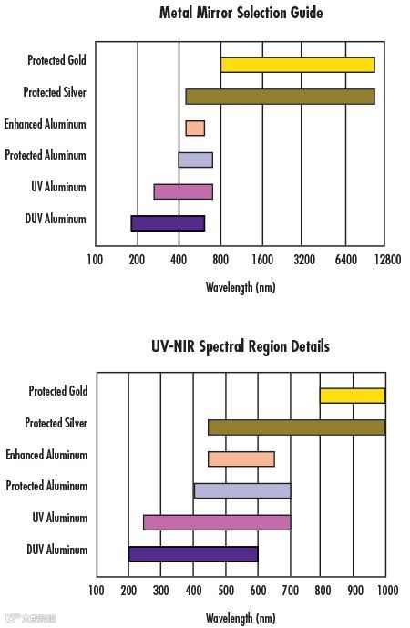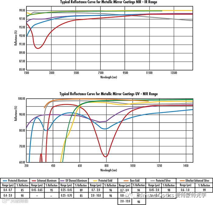 和增透膜一样,金属反射膜在设计的时候也需要考虑光谱范围Edmund Optics®可为您提供一系列的金属保护膜,具有高反射率值,用于波长范围从 250nm 到 10μm 以上的应用。我们的标准金属反射膜包括保护性铝膜、增强性铝膜、紫外线增强性铝膜、保护性金膜和保护性银膜。保护性铝膜和增强性铝膜通常用于可视的应用。紫外线增强性铝膜可用于紫外线和可视应用。保护性金膜为红外线或近红外线波长提供高反射率。保护性银膜提供介于 500-800nm 的最高反射率,但由于其对变色敏感,最适用于作为后方表面反射镜。