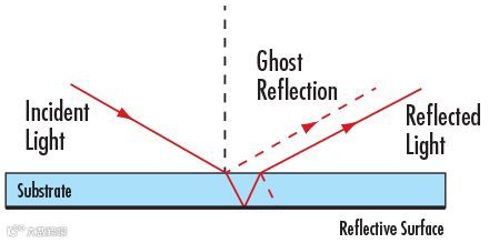 Edmund Optics® 提供各种镜基片和镀有标准金属膜、激光线膜、以及自定义宽带、窄带、单激光线、双激光线和激光线分光镜膜。我们所有的反射镜产品都是第一表面镜(见图1)具有高反射率膜,如金属或多层介质,沉积在玻璃基片的一个表面上(我们也提供了一些金属基片反射镜的同类产品)。相比之下,第二表面镜(见图2)与第一表面镜的制造方式相同,但在镀膜表面具有额外盖玻片(通常是镀银)用于保护。该盖玻片保护膜层免受划伤和氧化。Edmund Optics 建议使用第一表面镜,而非第二表面镜的三大原因(图2)如下: